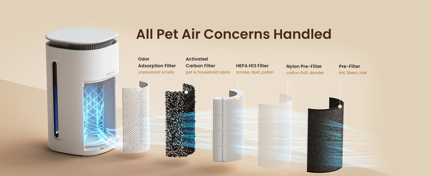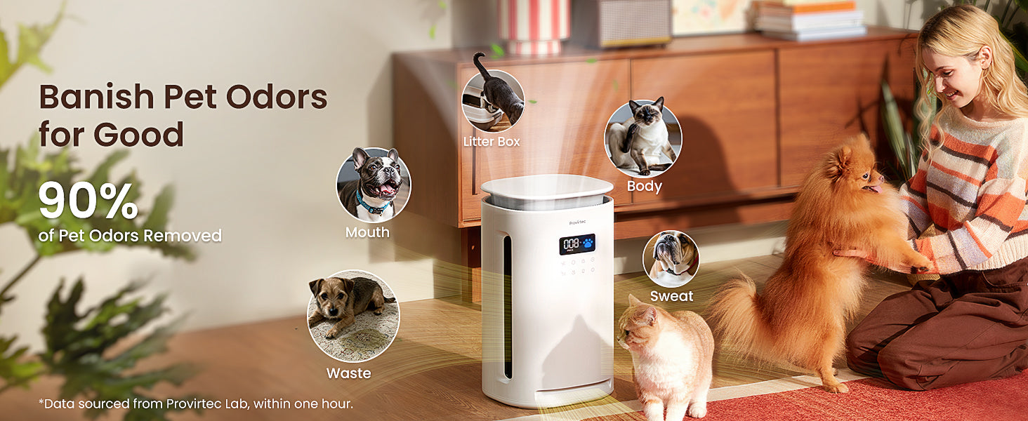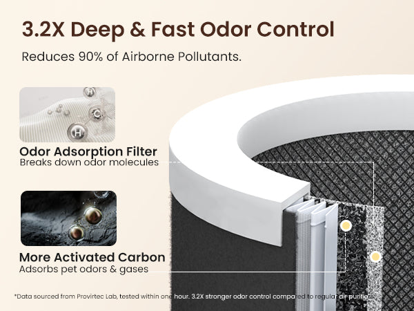 Breathe Freely, 3.2X Faster. Stop unpleasant odors at the source with this air purifier for pets! Our upgraded Activated Carbon filter and dedicated odor adsorption layer work together to absorb and break down stubborn smells from litter boxes, urine and drool—achieving 90% odors reduction 3.2x faster than standard filters. Enjoy close cuddles without the unwanted scents. - Paw-Approved & Ultra-Safe