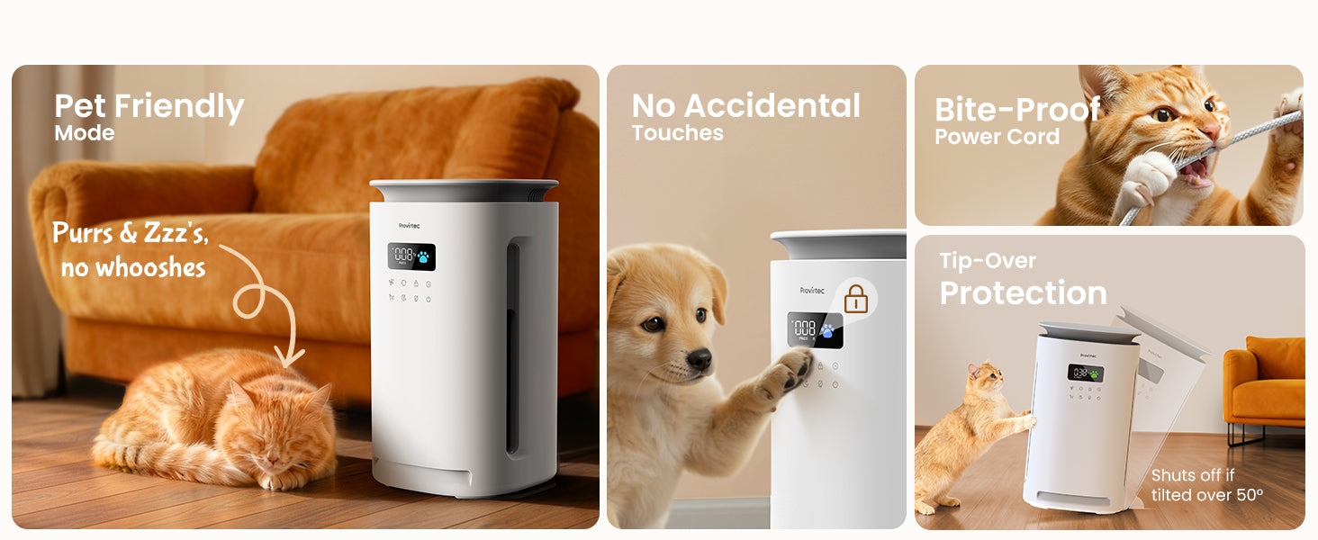 Because Their Comfort Comes First. No more startled pets! Our air purifiers for home pets have rounded, pet-proof design to prevent climbing. The gentle Pet Friendly Mode automatically adjusts fan speed to avoid startling drafts. With a chew-resistant cord, child lock and tip-over protection, you get 24/7 peace of mind. Love them fiercely, protect them completely. - Your 24/7 Air Assistant