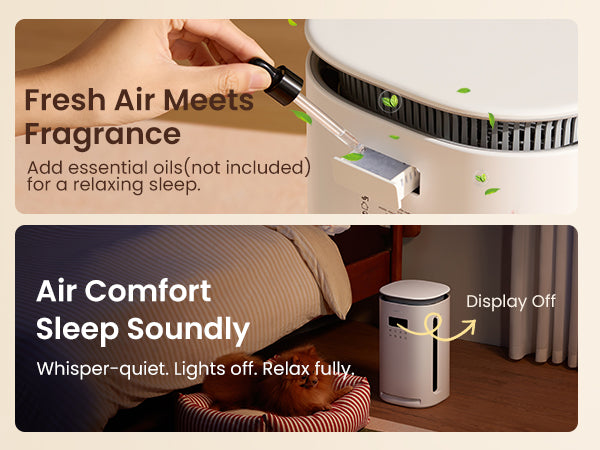 Enjoy uninterrupted rest. In Sleep Mode, our air purifiers for bedroom run quieter than a whisper (23dB) and automatically dim all lights for total darkness. Add a few drops of essential oil to the built-in aroma tray (not included) to create a clean, calming, and peaceful sleep environment for you and your furry family.