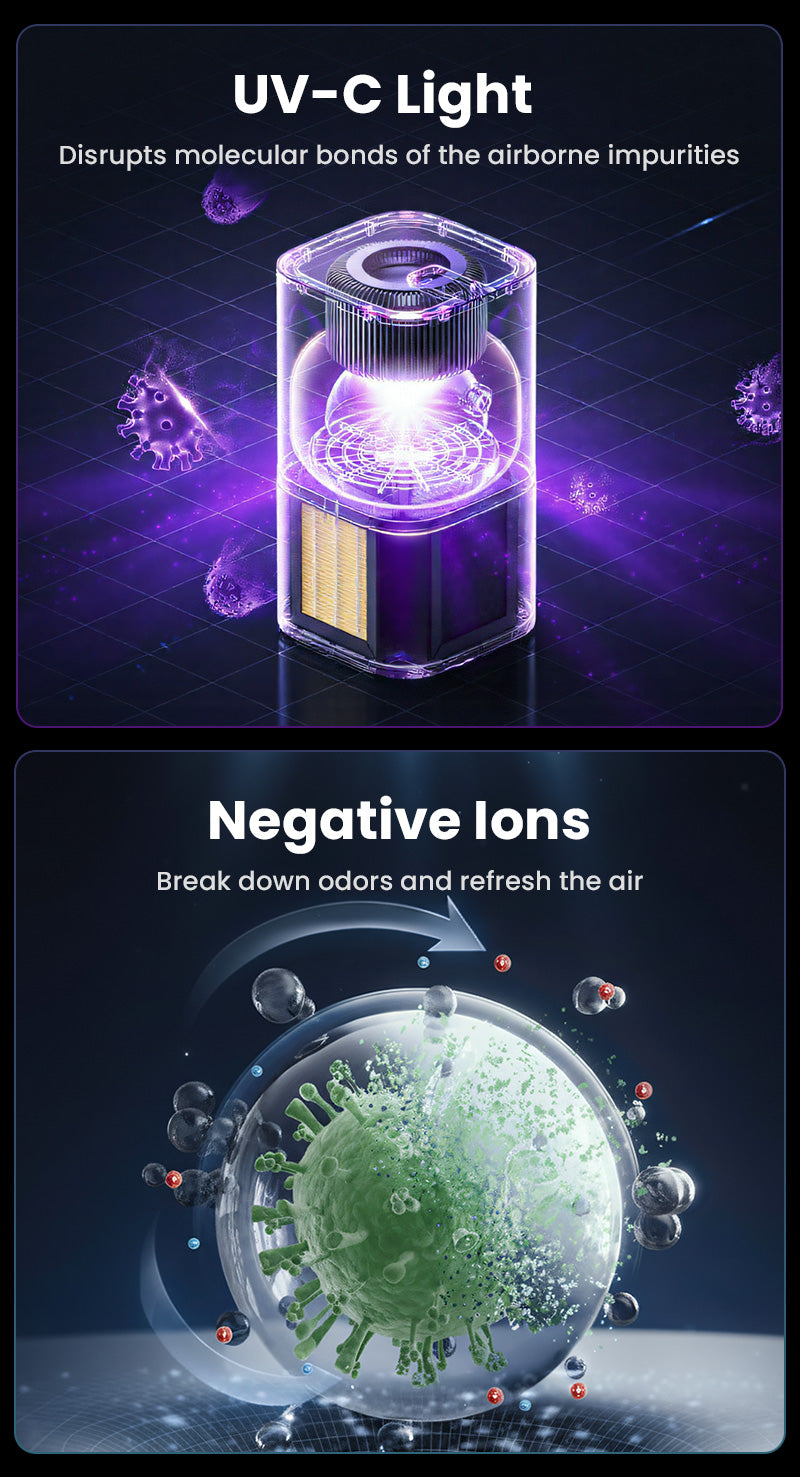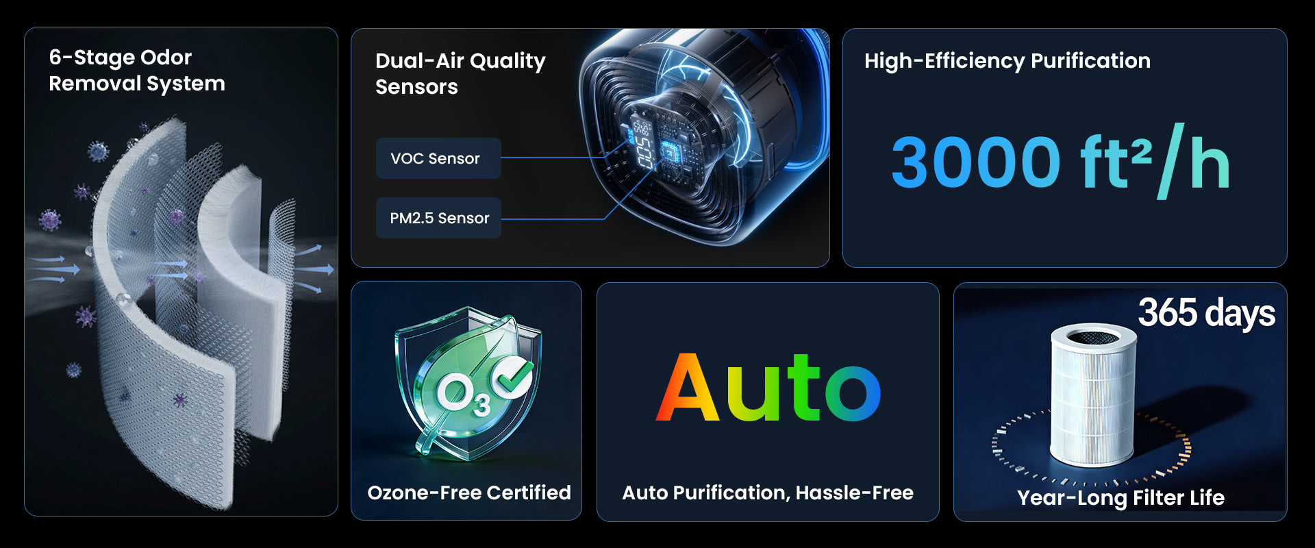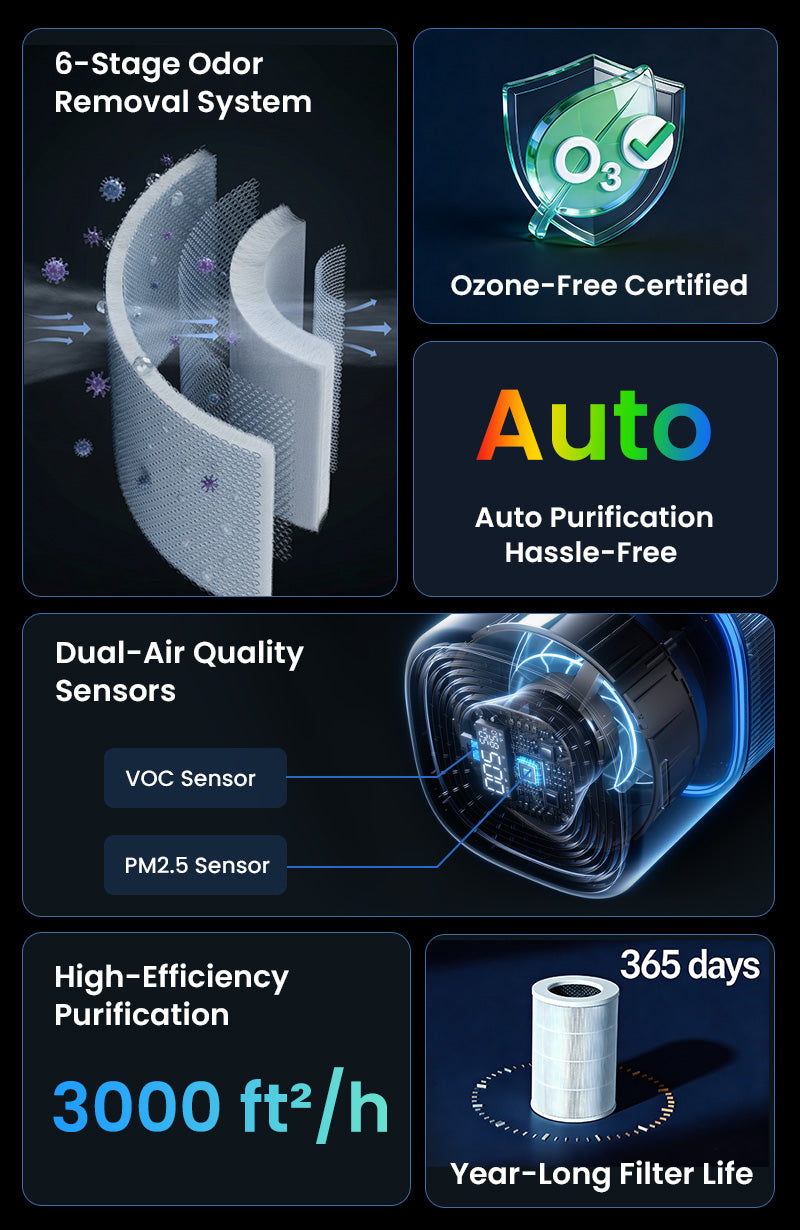High-sensitivity VOC sensors instantly detect odors. The powerful odor filter removes up to 90% of odor molecules in 1 hour, while UV-C sterilization neutralizes bacteria, viruses, and mold spores. High-density negative ions further break down odors and refresh the air. From kitchen fumes to pet smells and lingering smoke, the 6-layer odor removal system keeps large rooms air consistently fresh, clean, and safe. -