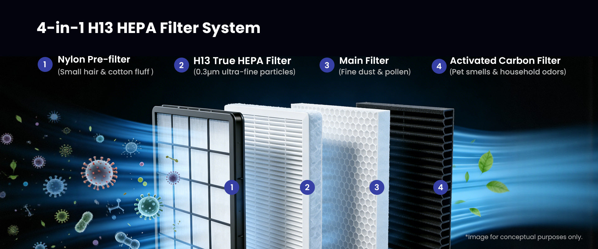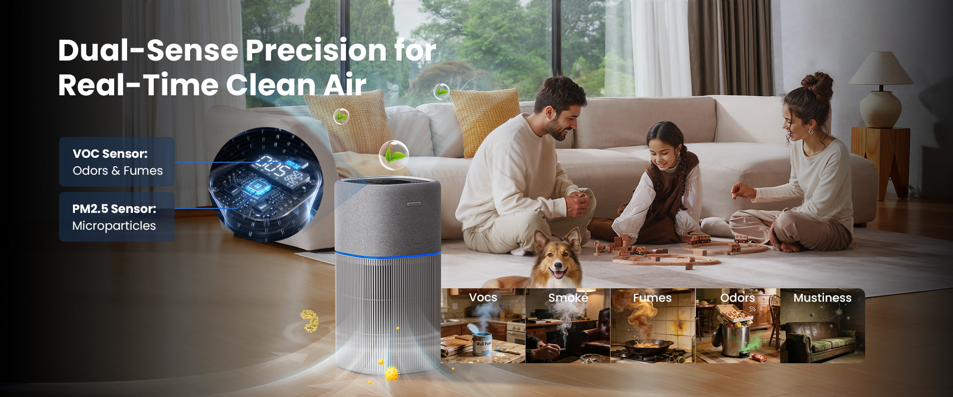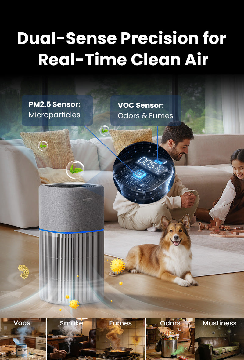 PM2.5 & VOC sensors track particles and odors in real time, capturing smoke, pet dander, cooking fumes, and even mold odors. The 4-in-1 core filter removes 99.97% of common allergens and microscopic particles down to 0.03 μm, providing continuous protection for living rooms after smoking,active pet areas, kitchens, bedrooms, and damp basements. Every corner of your home stays fresh, clean, and comfortably breathable. -