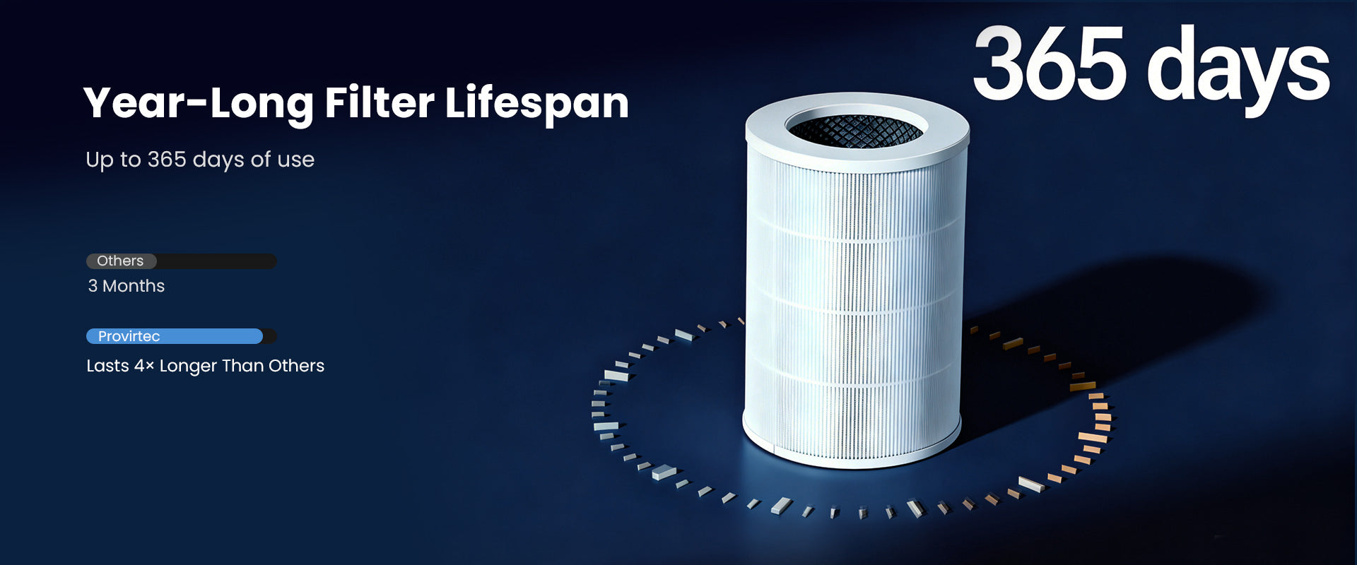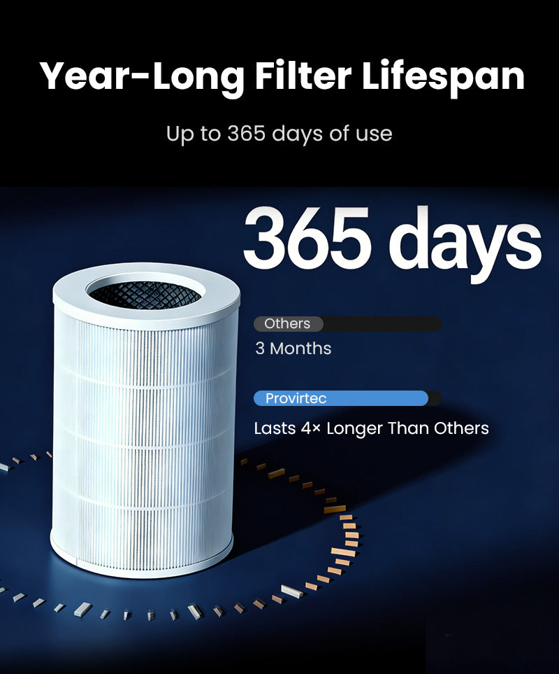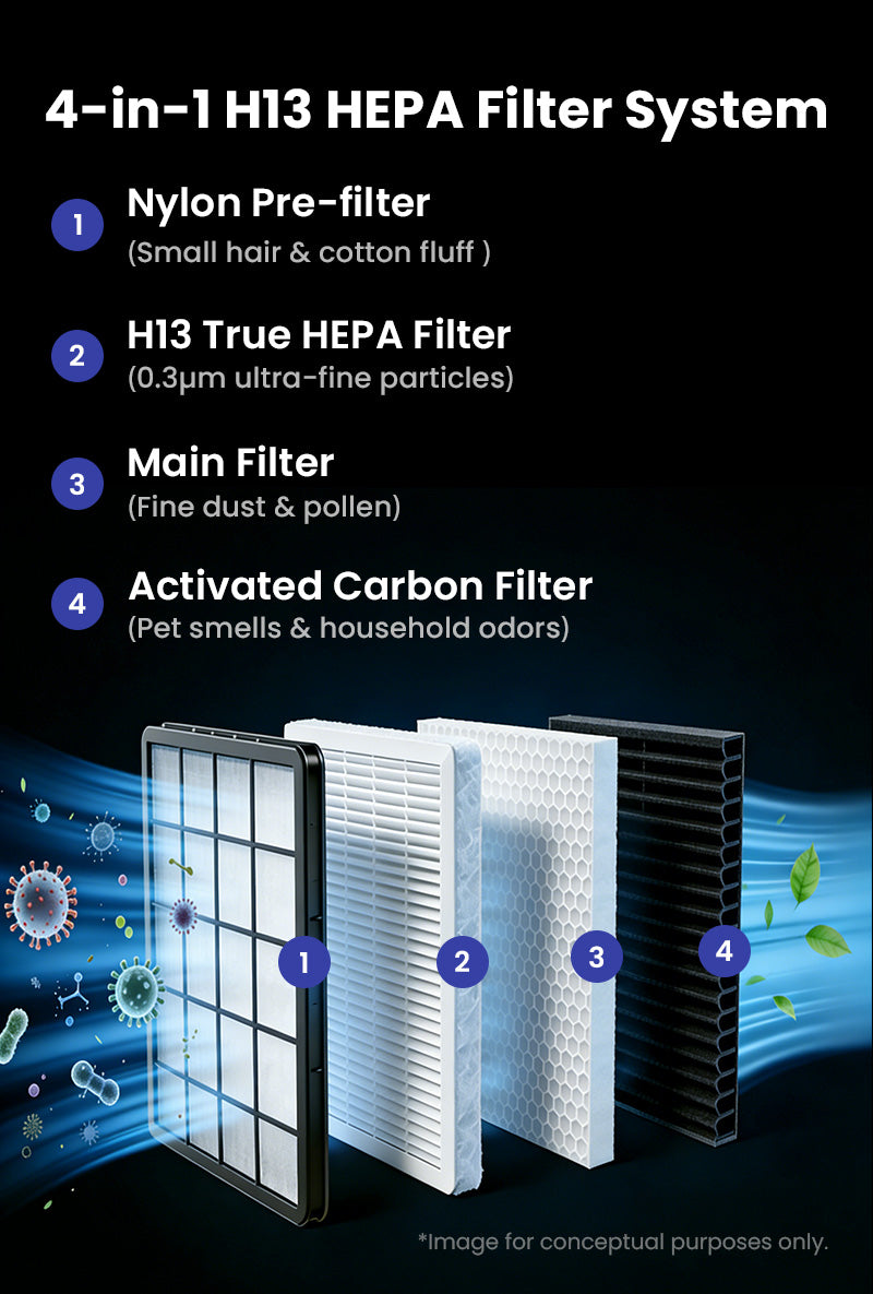 PM2.5 & VOC sensors track particles and odors in real time, capturing smoke, pet dander, cooking fumes, and even mold odors. The 4-in-1 core filter removes 99.97% of common allergens and microscopic particles down to 0.03 μm, providing continuous protection for living rooms after smoking,active pet areas, kitchens, bedrooms, and damp basements. Every corner of your home stays fresh, clean, and comfortably breathable. -