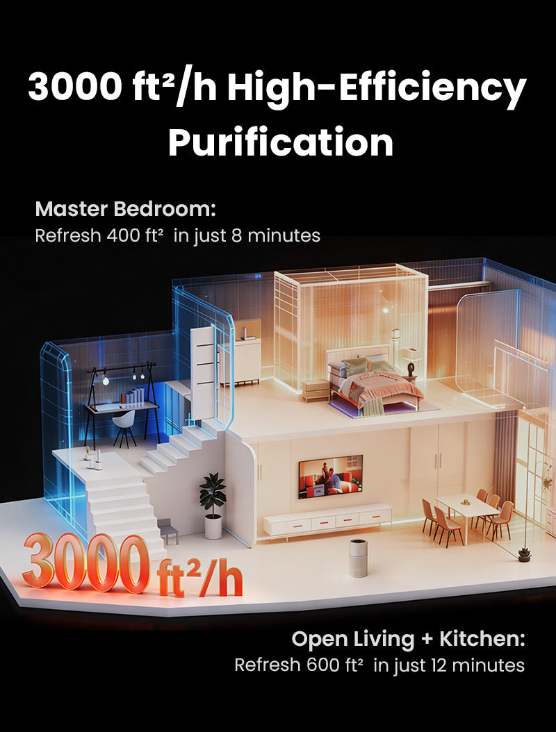 With a purification efficiency of 3000 ft²/h, it easily covers open-concept living rooms, kitchens, and basements, making it ideal for smoke, pet odors, cooking fumes, and mold-prone areas. The 360° vertical air inlets quickly draw in odors and airborne particles. Refresh a 600 ft² living room & kitchen in just 12 minutes, or a 400 ft² bedroom in 8 minutes, ensuring large spaces feel instantly revitalized and comfortably breathable. -