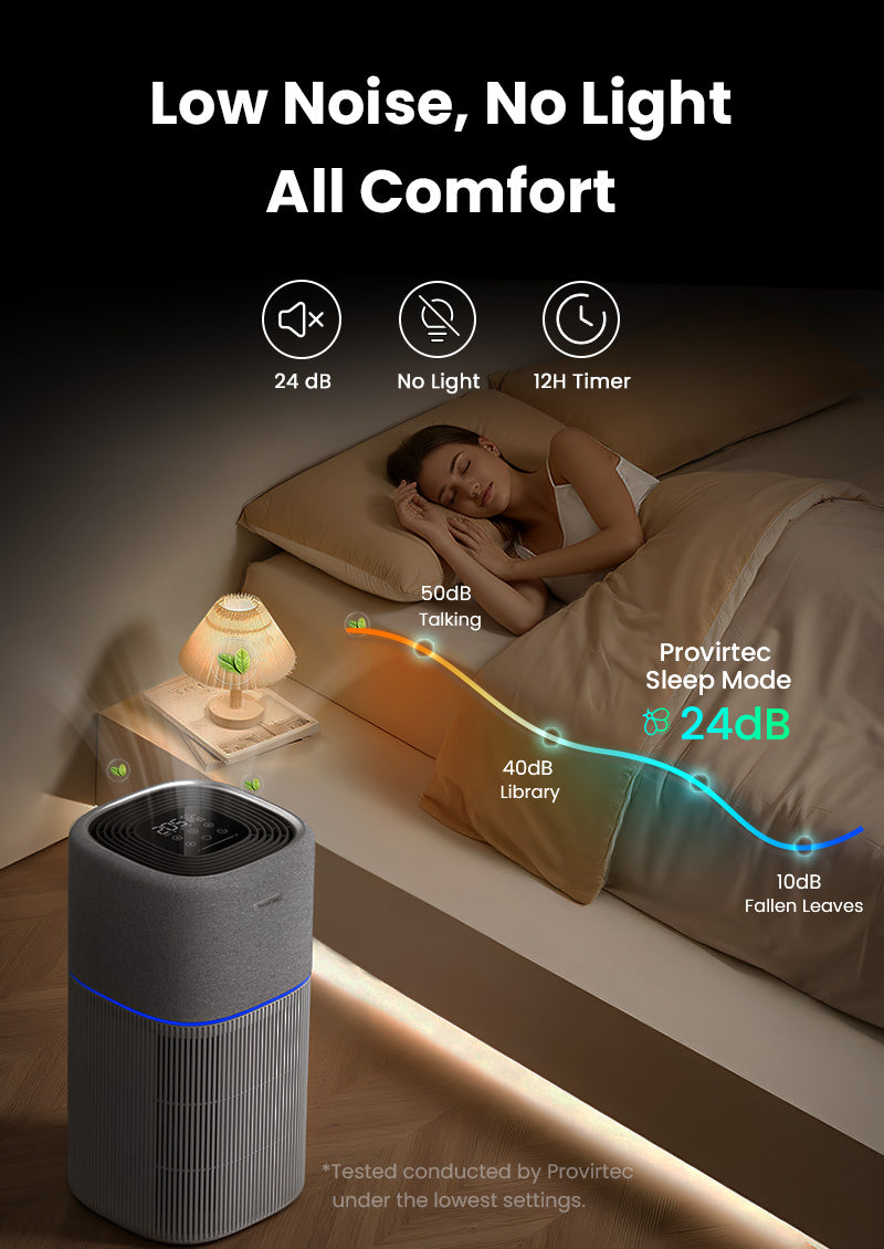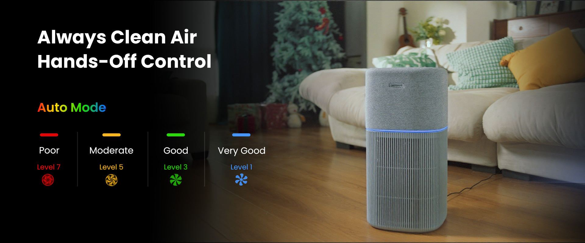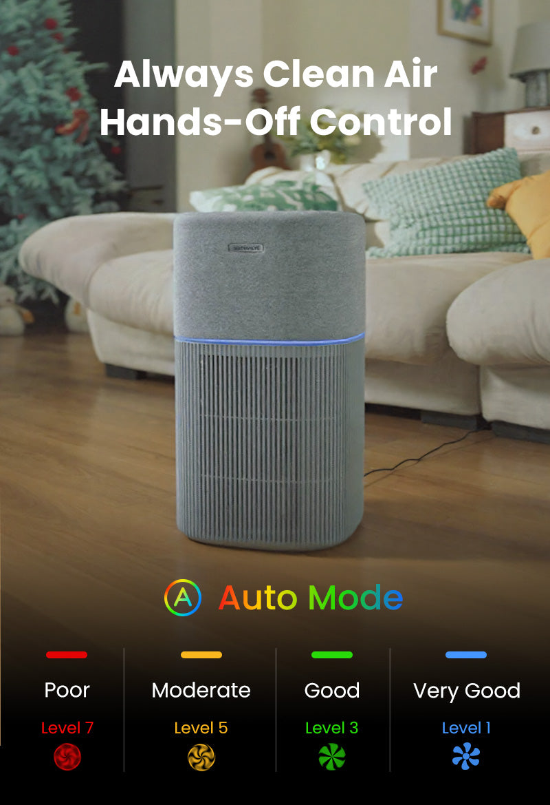 Supports Sleep, Turbo, and Auto modes to meet different air needs. Sleep mode operates quietly with no light interference for undisturbed rest. Turbo mode rapidly removes smoke, cooking fumes, and pet odors, refreshing large spaces in minutes. Auto mode intelligently detects air quality and starts with one touch, filling your home with fresh, clean air all day long.